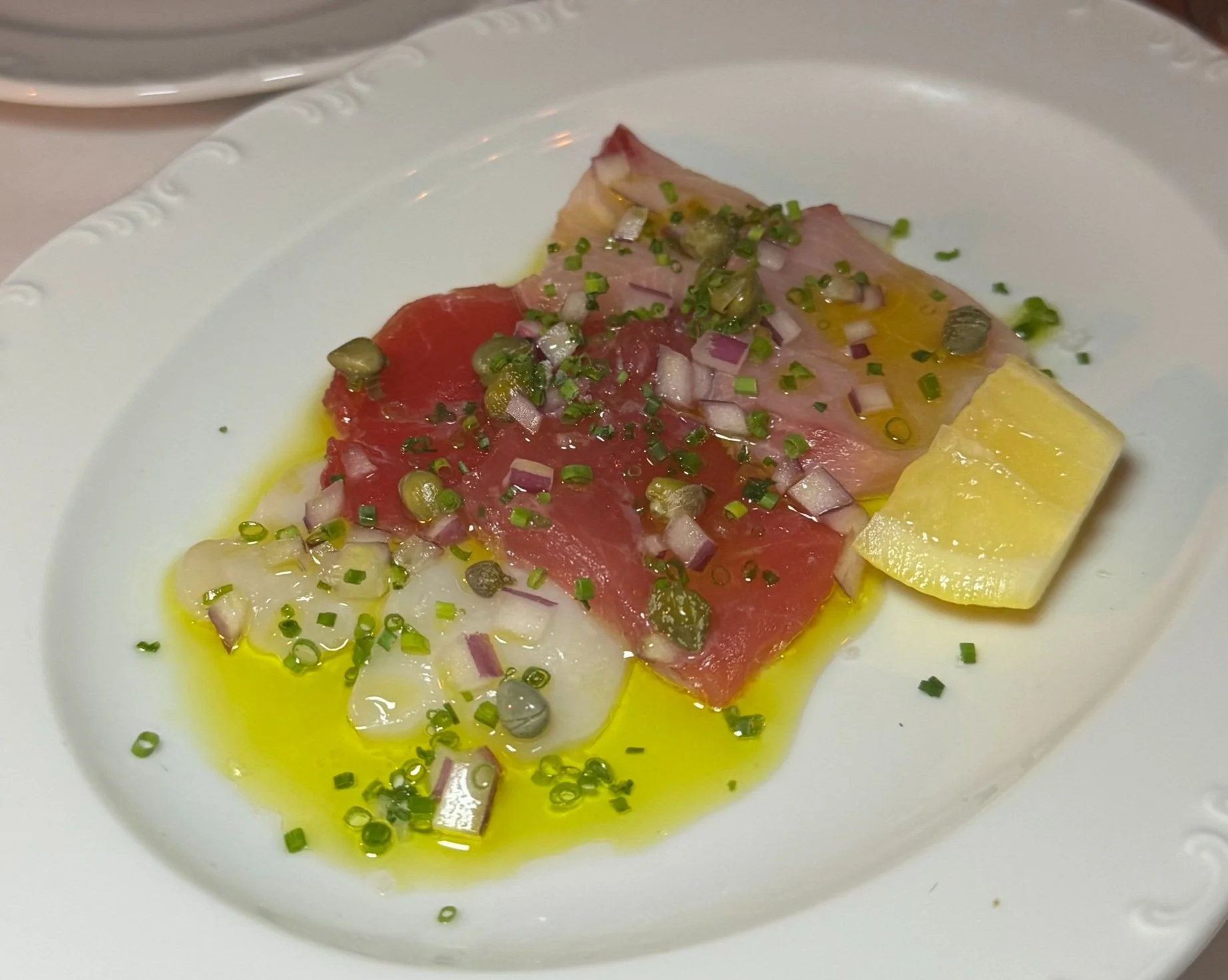 We started with two appetizers: The Sicilian Sashimi was a standout. The restaurant graciously accommodated my co-diner's allergy, plating the trout separately for me. The tuna, trout, yellowtail, and scallop were exquisitely fresh, drizzled with high-quality olive oil, and perfectly seasoned with salt, chives, capers, and finely diced shallots. I would order this again in a heartbeat.